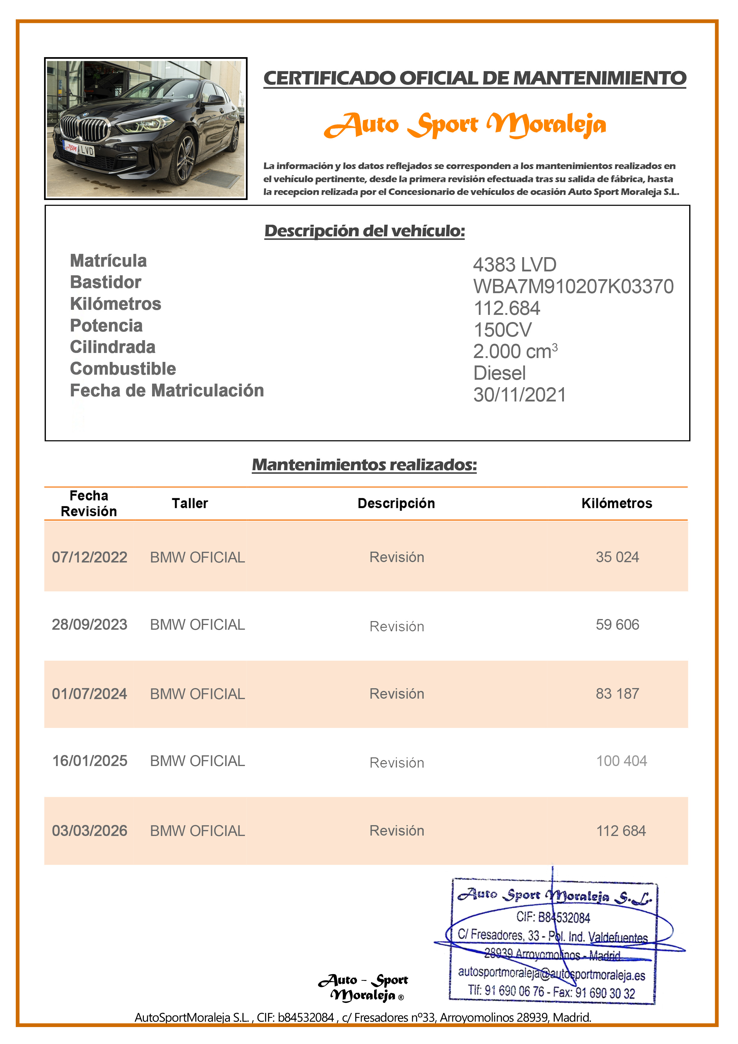 Vehículo nacional de un único propietario. El precio incluye: IVA (deducible) y 1 año de Garantía. Kilometraje y ausencia de golpes estructurales certificados. Última revisión: Concesionario oficial BMW el 03/03/2026 a los 112.684kms. Visítanos en nuestro concesionario en Arroyomolinos.