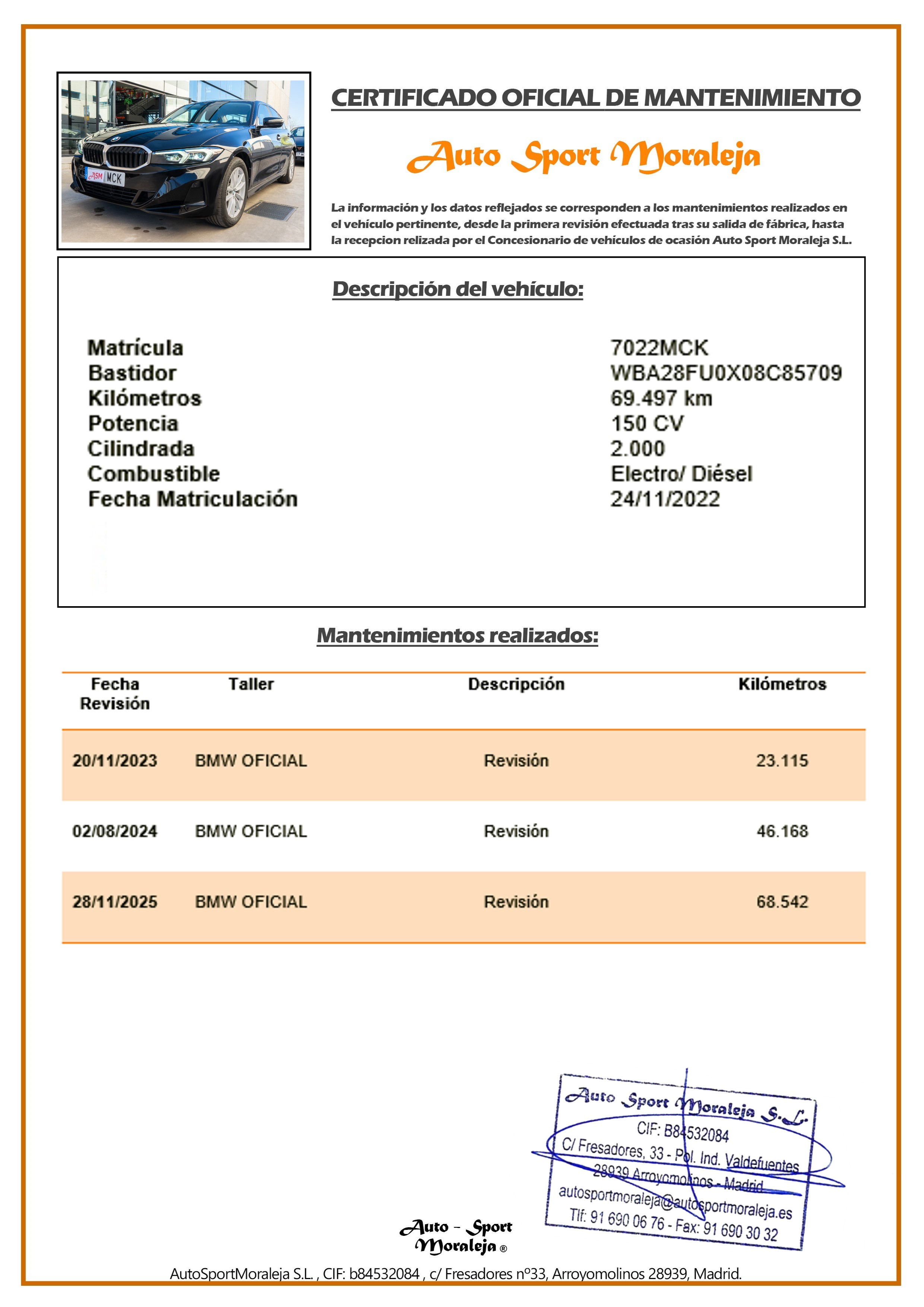 Vehículo nacional de un único propietario. El precio incluye: IVA (deducible) y 1 año de Garantía. Kilometraje y ausencia de golpes estructurales certificados. Última revisión: concesionario oficial BMW el 28/11/2025 a los 68.542kms. Visítanos en nuestro concesionario en Arroyomolinos.