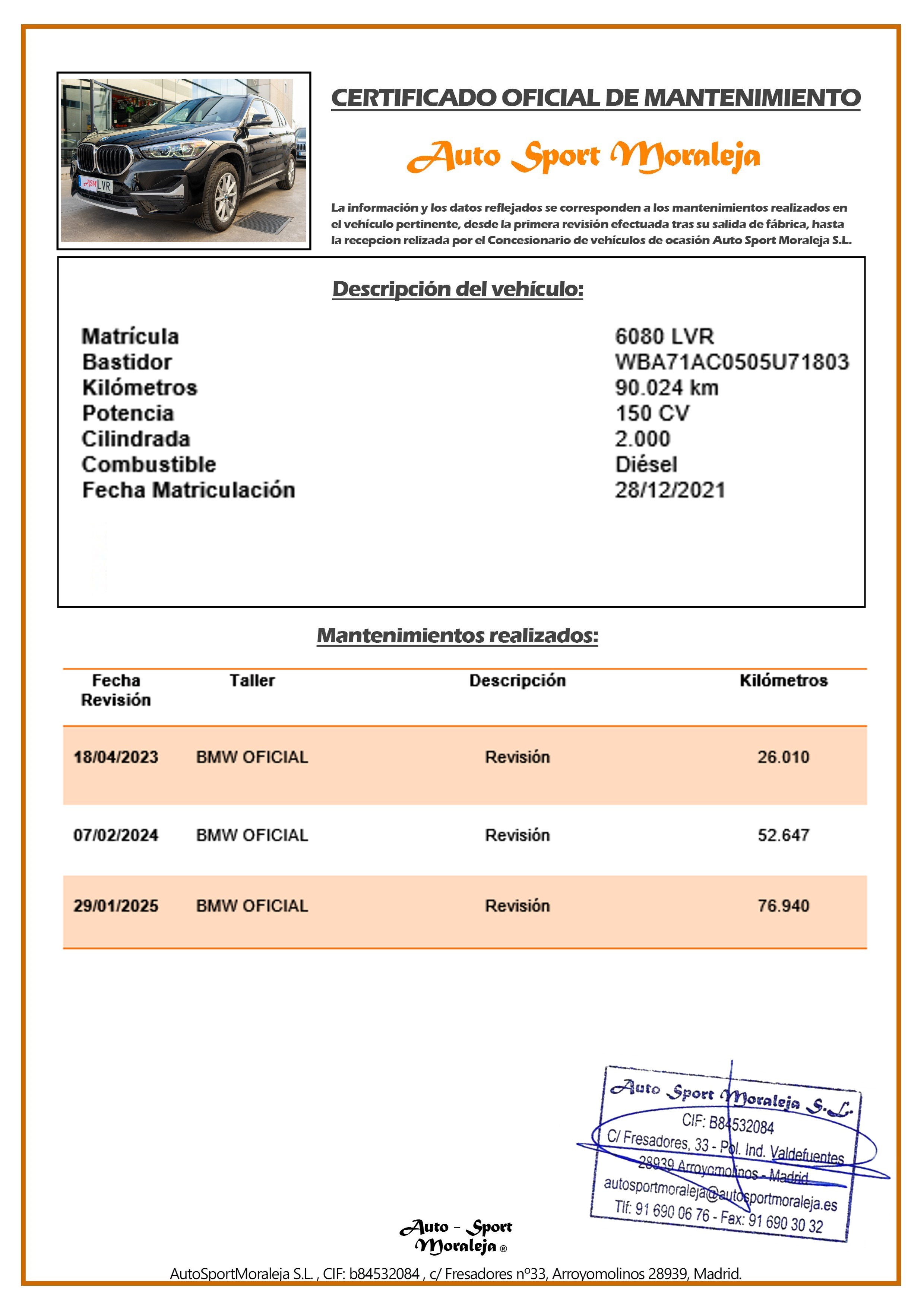Vehículo nacional de un único propietario. El precio incluye: IVA (deducible) y 1 año de Garantía. Kilometraje y ausencia de golpes estructurales certificados. Última revisión: concesionario oficial BMW el 29/01/2025 a los 76.940kms. Visítanos en nuestro concesionario en Arroyomolinos.
