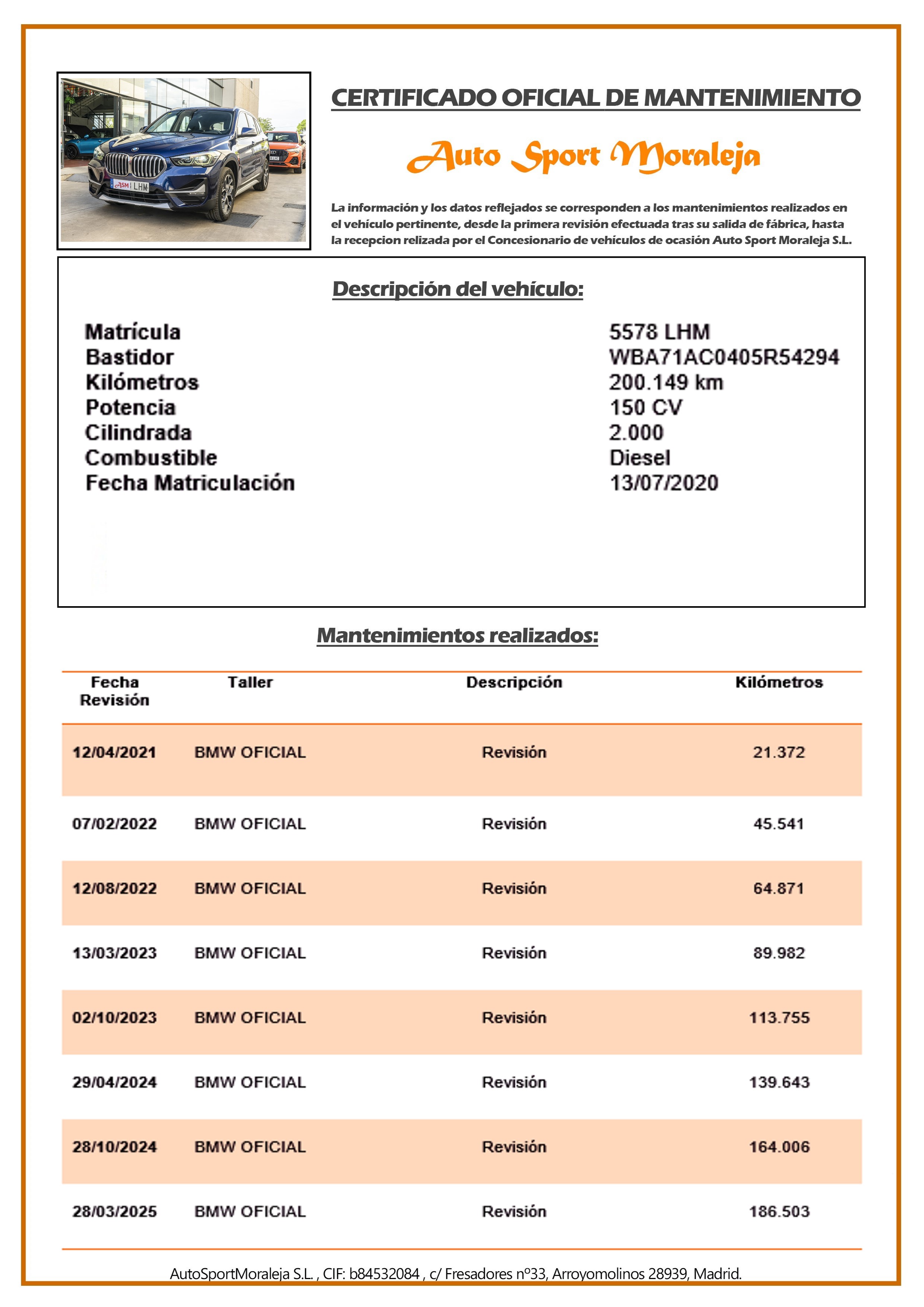 Vehículo nacional de un único propietario. El precio incluye: IVA (deducible) y 1 año de Garantía (motor y caja de cambios). Kilometraje y ausencia de golpes estructurales certificados por Carfax. Última revisión: concesionario oficial BMW el 28/03/2025 a los 186.503kms. Visítanos en nuestro concesionario en Arroyomolinos.