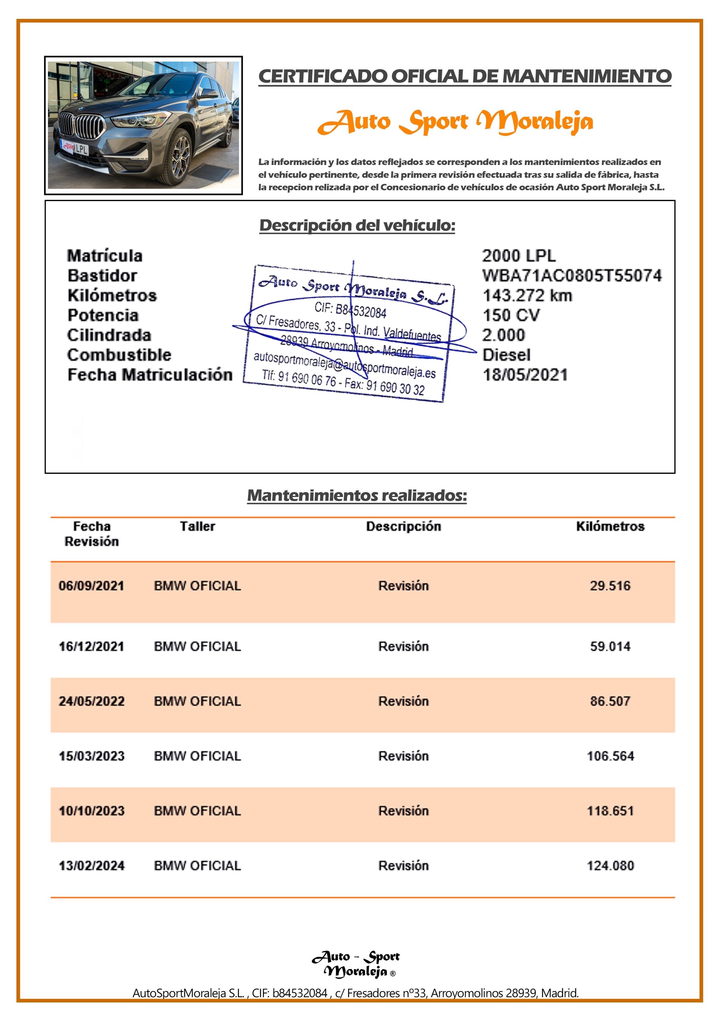 Vehículo nacional de un único propietario. El precio incluye: IVA (deducible) y 1 año de Garantía. Kilometraje y ausencia de golpes estructurales certificados. Última revisión: concesionario oficial BMW el 22/01/2026 a los 143.234kms. Visítanos en nuestro concesionario en Arroyomolinos.