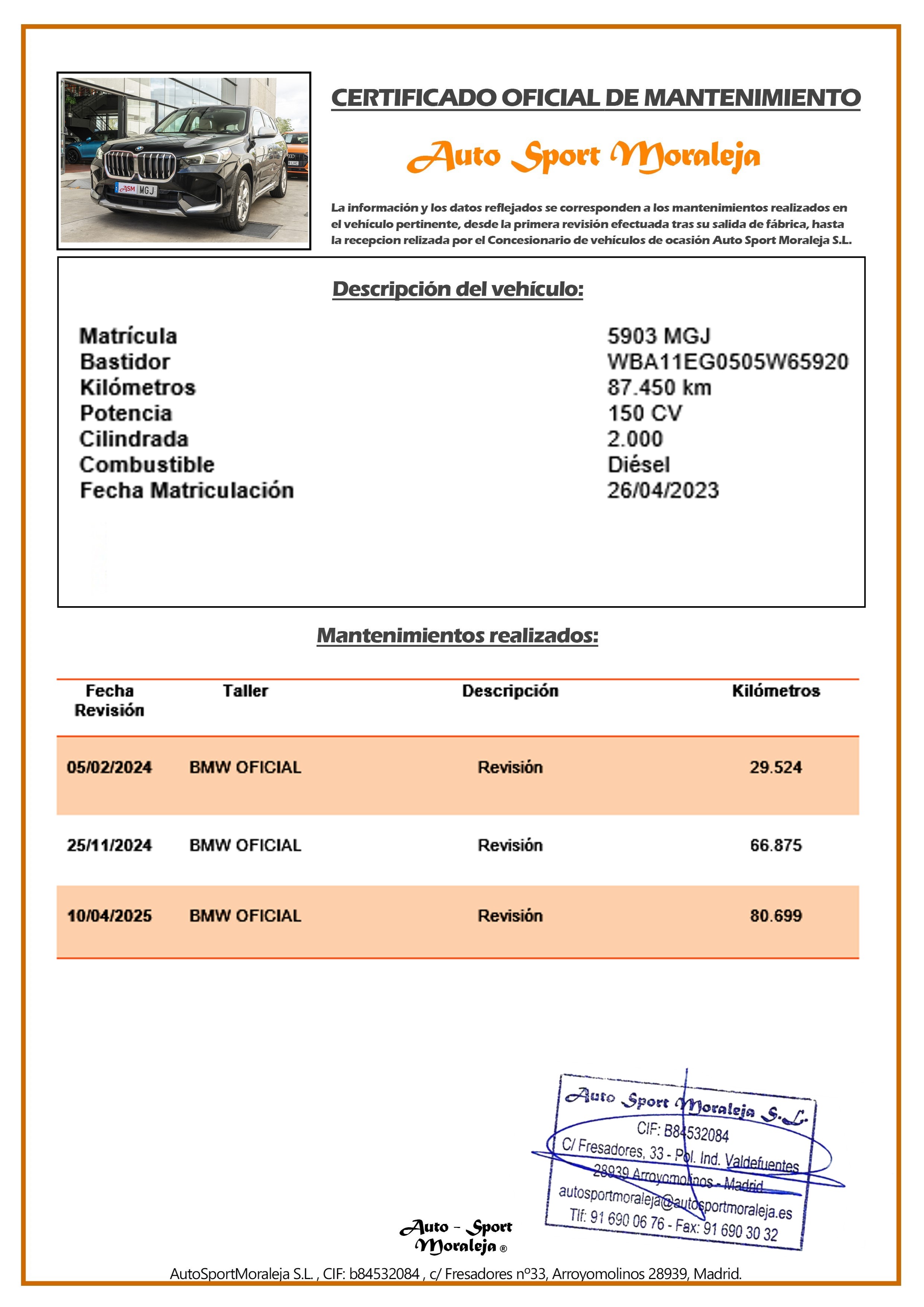 Vehículo nacional de un único propietario. El precio incluye: IVA (deducible) y 1 año de Garantía, incluyendo la oficial de la casa hasta abril de 2026. Kilometraje y ausencia de golpes estructurales certificados por Carfax. Última revisión: concesionario oficial BMW el 10/04/2025 a los 80.699kms. Visítanos en nuestro concesionario en Arroyomolinos.