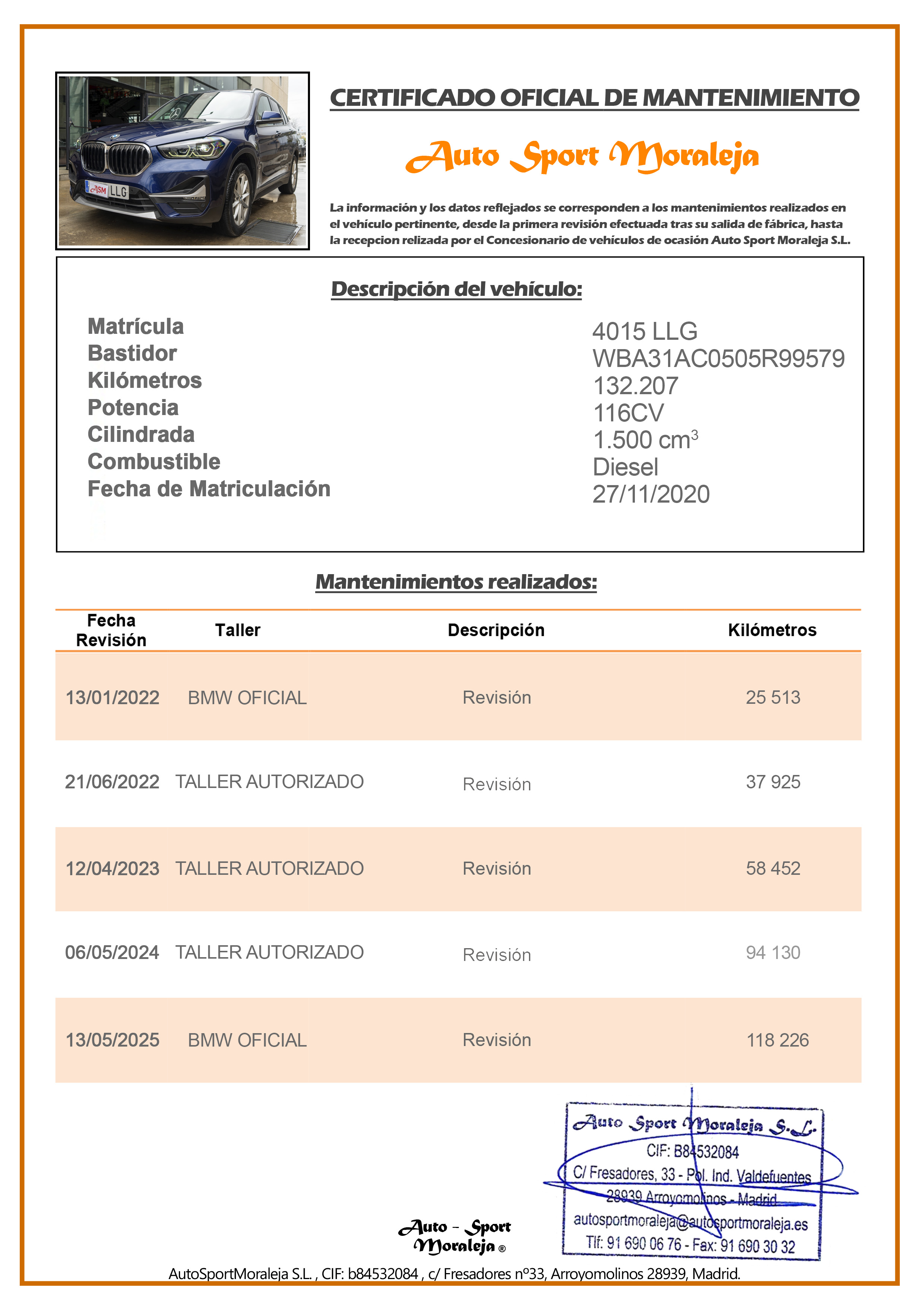 Vehículo nacional de un único propietario. El precio incluye: IVA (deducible) y 1 año de Garantía. Kilometraje y ausencia de golpes estructurales certificados. Última revisión: Concesionario oficial BMW el 13/05/2025 a los 118.226kms. Visítanos en nuestro concesionario en Arroyomolinos.