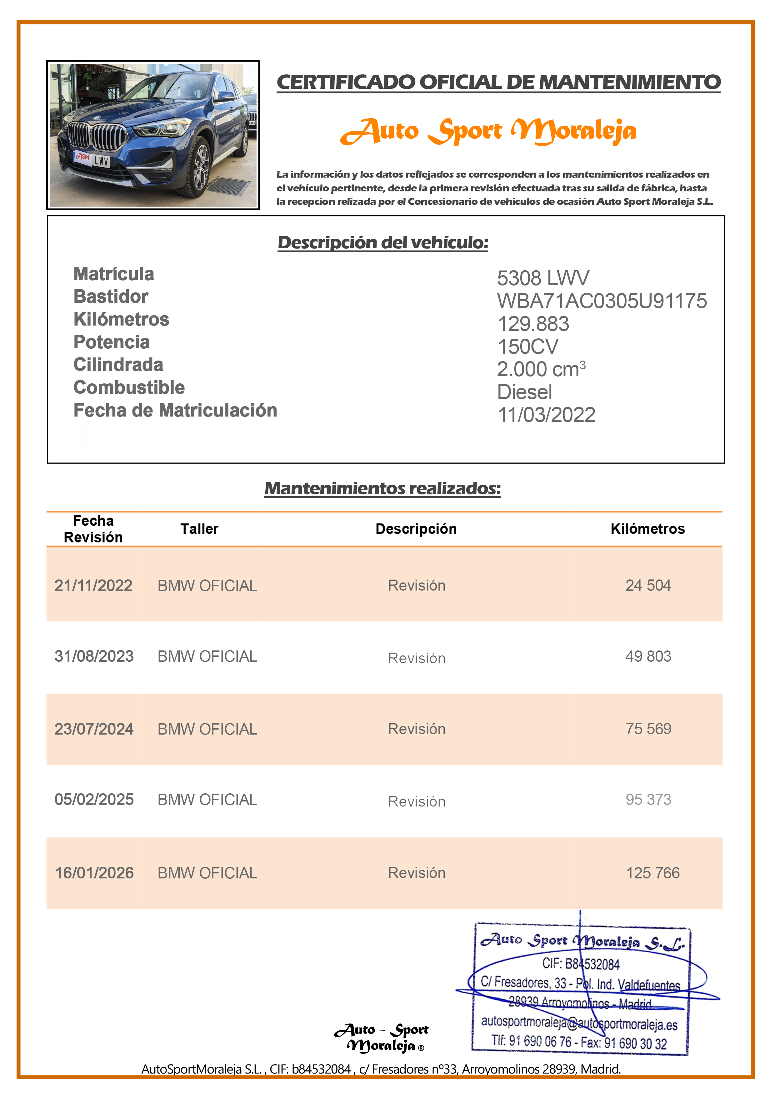 Vehículo nacional de un único propietario. El precio incluye: IVA (deducible) y 1 año de Garantía. Kilometraje y ausencia de golpes estructurales certificados. Última revisión: Concesionario oficial BMW el 16/01/2026 a los 125.766kms. Visítanos en nuestro concesionario en Arroyomolinos.