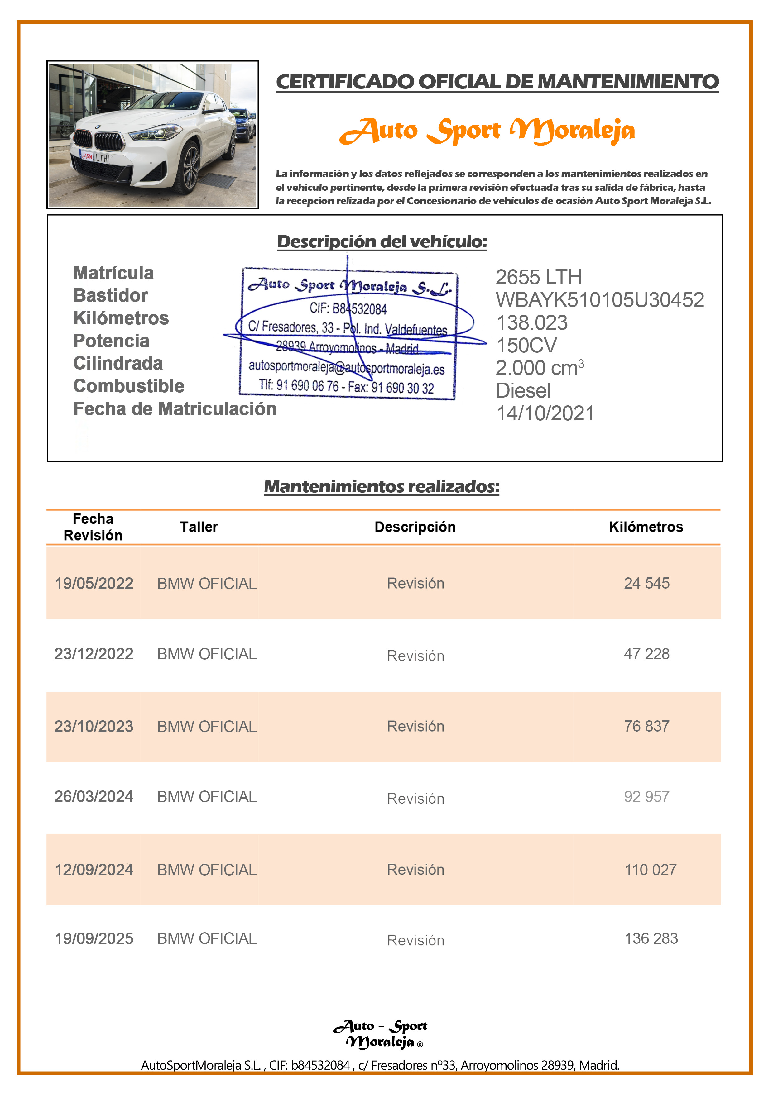 Vehículo nacional de un único propietario. El precio incluye: IVA (deducible) y 1 año de Garantía. Kilometraje y ausencia de golpes estructurales certificados por Carfax. Última revisión: Concesionario oficial BMW el 19/09/2025 a los 136.283kms. Visítanos en nuestro concesionario en Arroyomolinos.