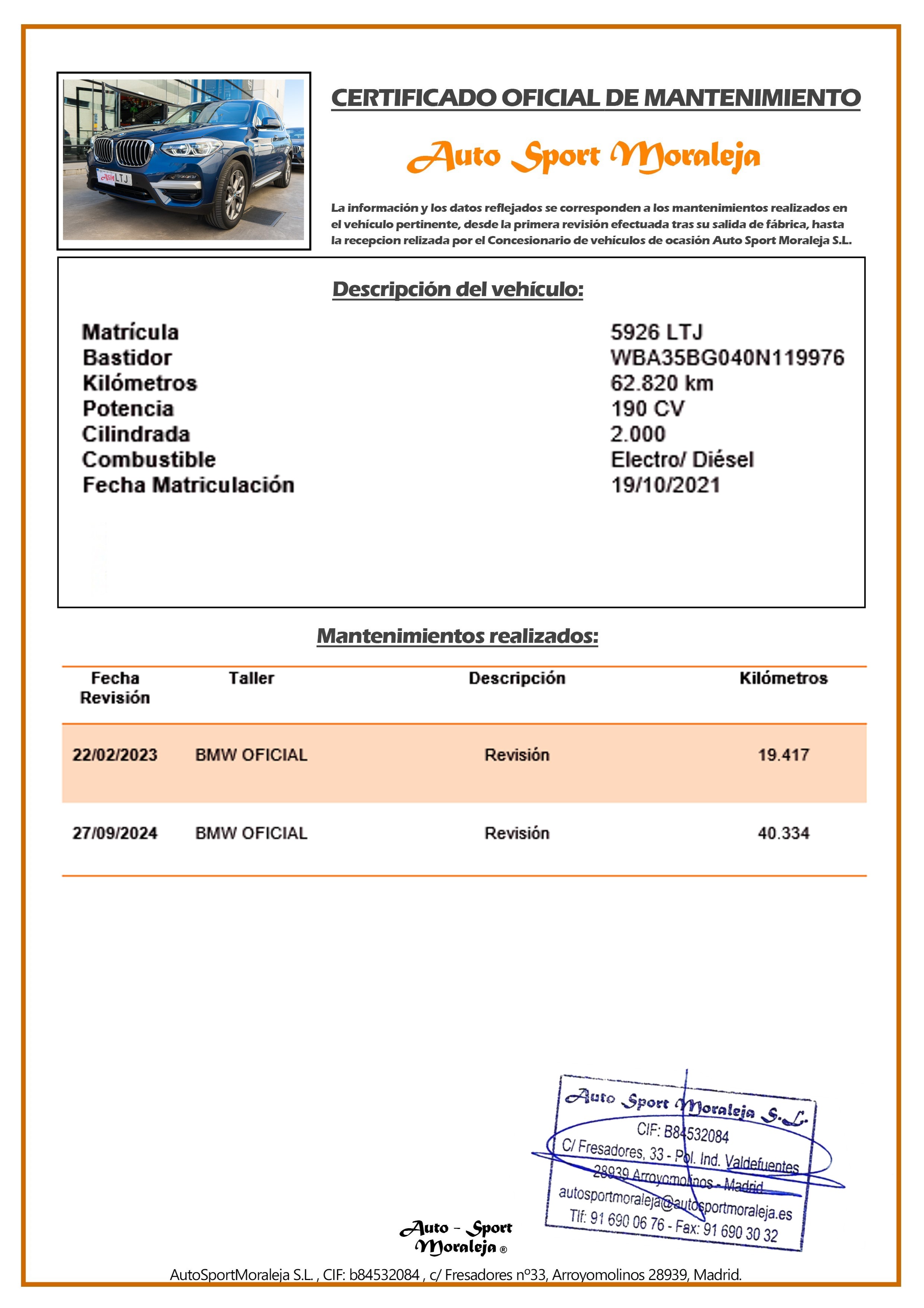 Vehículo nacional de un único propietario. El precio incluye: IVA (deducible) y 1 año de Garantía. Kilometraje y ausencia de golpes estructurales certificados. Última revisión: Concesionario oficial BMW el 27/09/2024 a los 40.334kms. Visítanos en nuestro concesionario en Arroyomolinos.