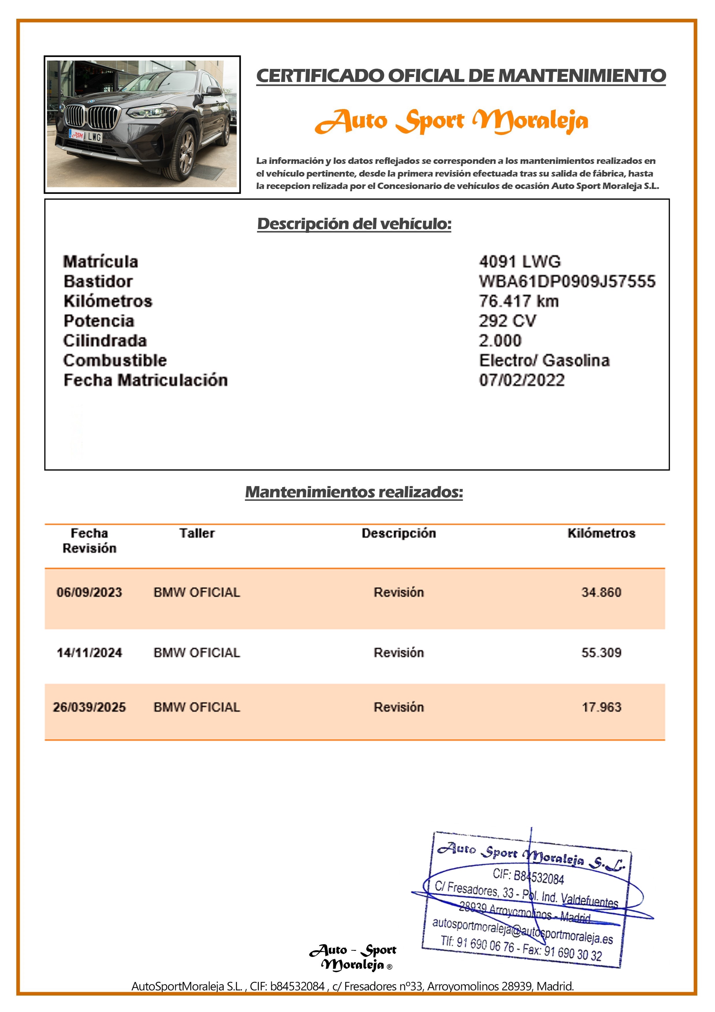 Vehículo nacional de un único propietario. El precio incluye: IVA (deducible) y 1 año de Garantía. Kilometraje y ausencia de golpes estructurales certificados. Última revisión: Concesionario oficial BMW el 08/07/2025 a los 67.652kms. Visítanos en nuestro concesionario en Arroyomolinos.
