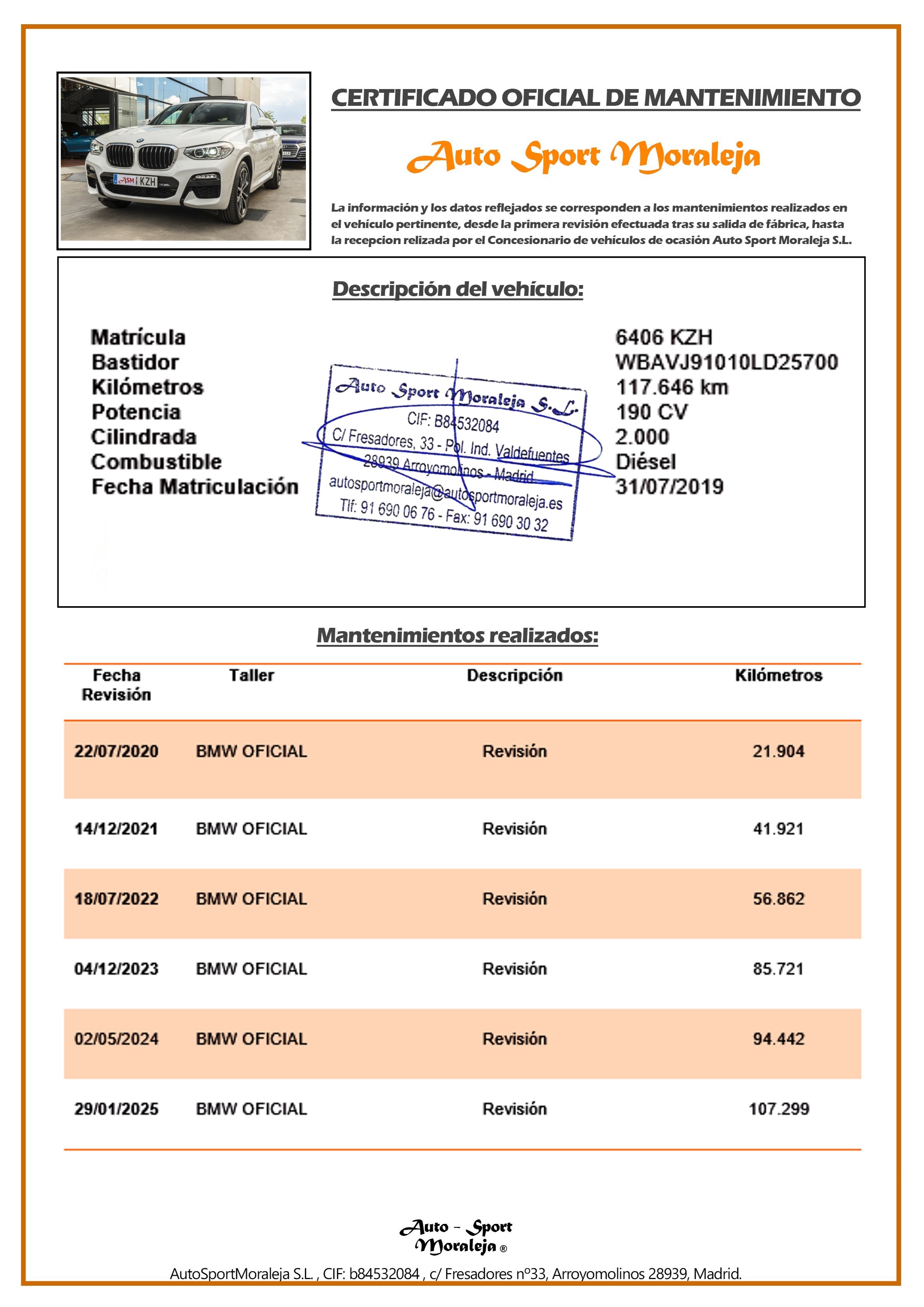 Vehículo nacional de un único propietario. El precio incluye: IVA (deducible) y 1 año de Garantía. Kilometraje y ausencia de golpes estructurales certificados por Carfax. Última revisión: concesionario oficial BMW el 29/01/2025 a los 107.299kms. Visítanos en nuestro concesionario en Arroyomolinos.