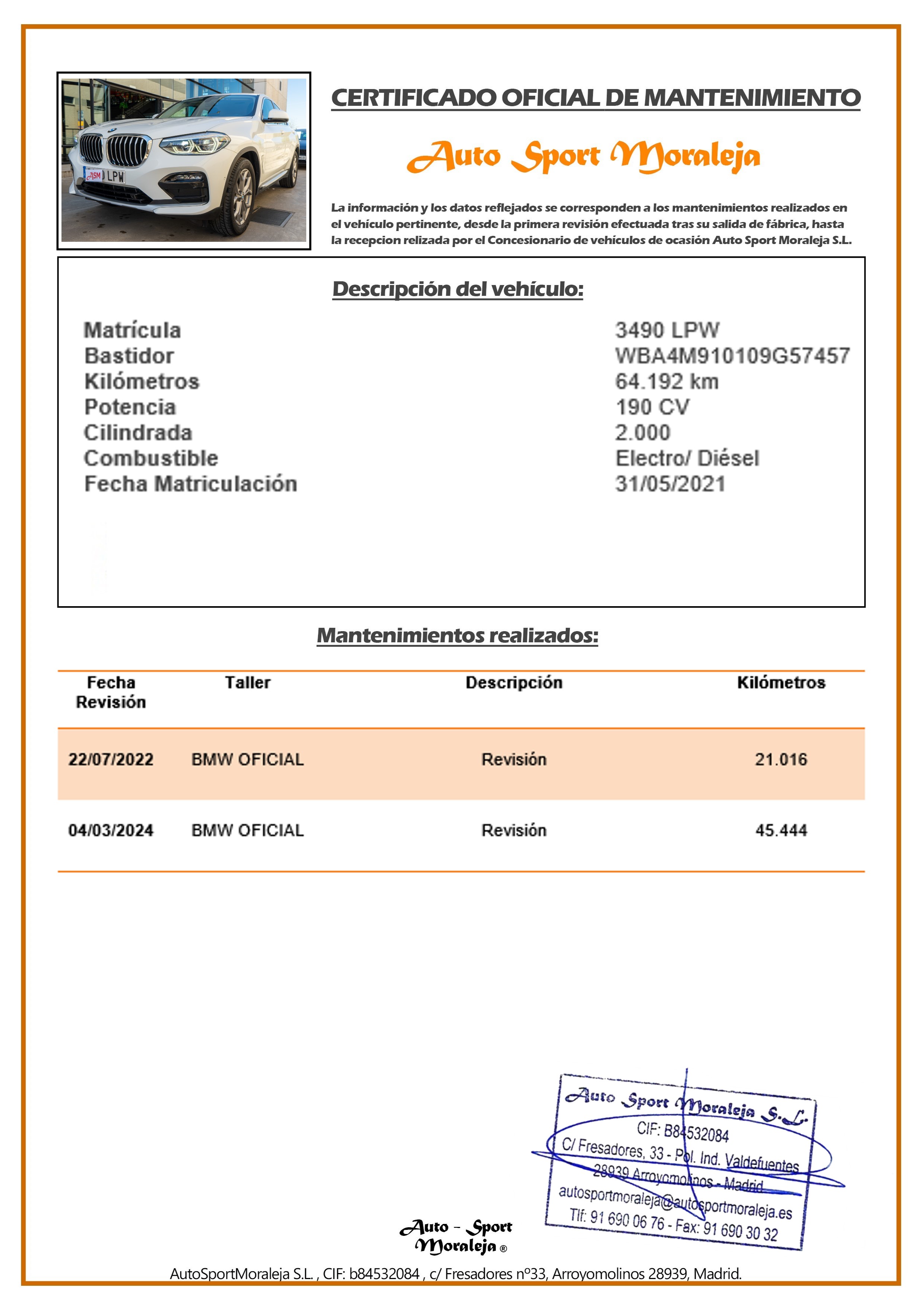 | N. Bastidor | WBA4M910109G57457 | |