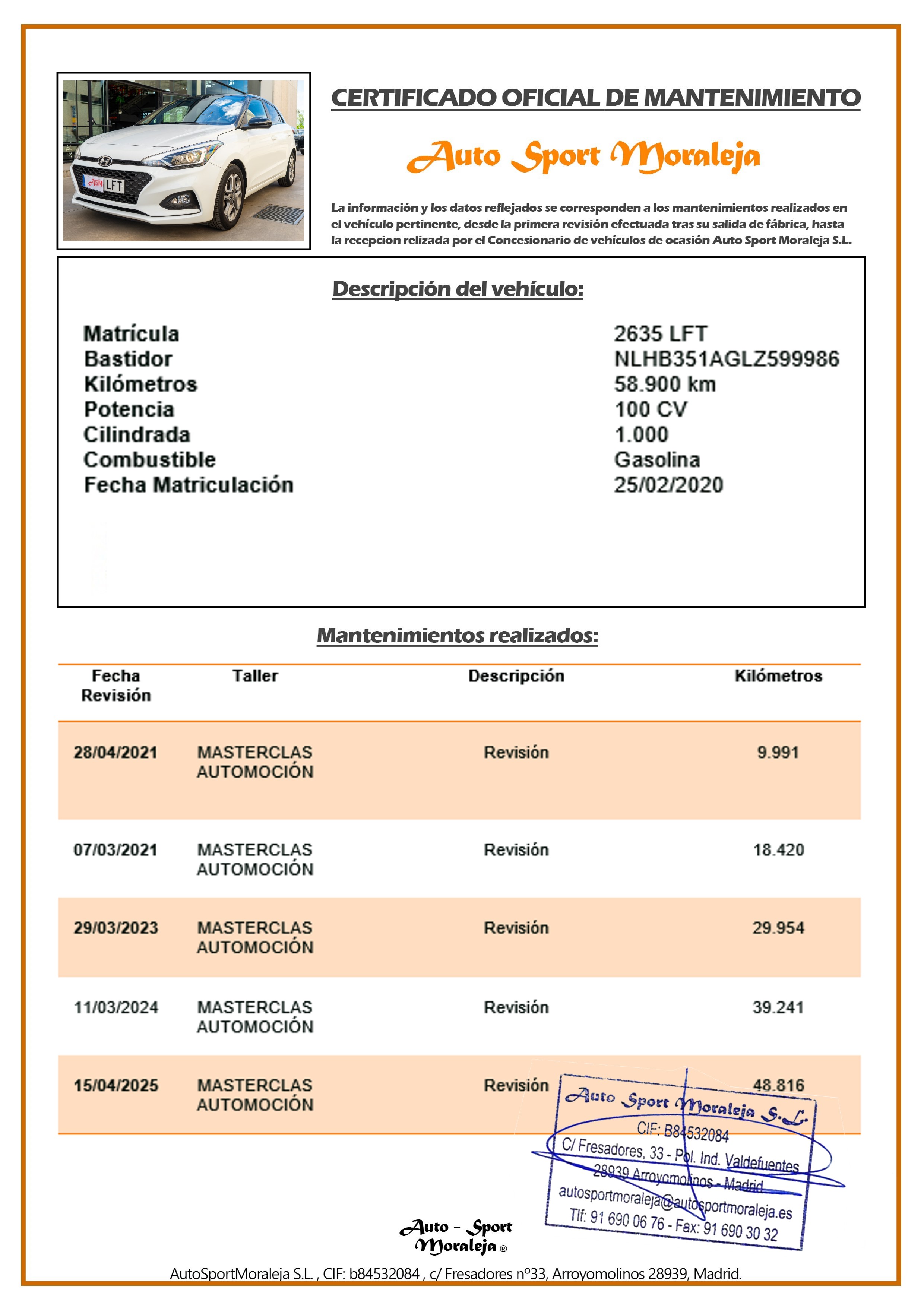 Vehículo nacional de un único propietario. El precio incluye: IVA (deducible) y 1 año de Garantía. Kilometraje y ausencia de golpes estructurales certificados. Última revisión: concesionario oficial Hyundai (Masterclass Automoción) el 15/04/2025 a los 48.816kms. Visítanos en nuestro concesionario en Arroyomolinos.