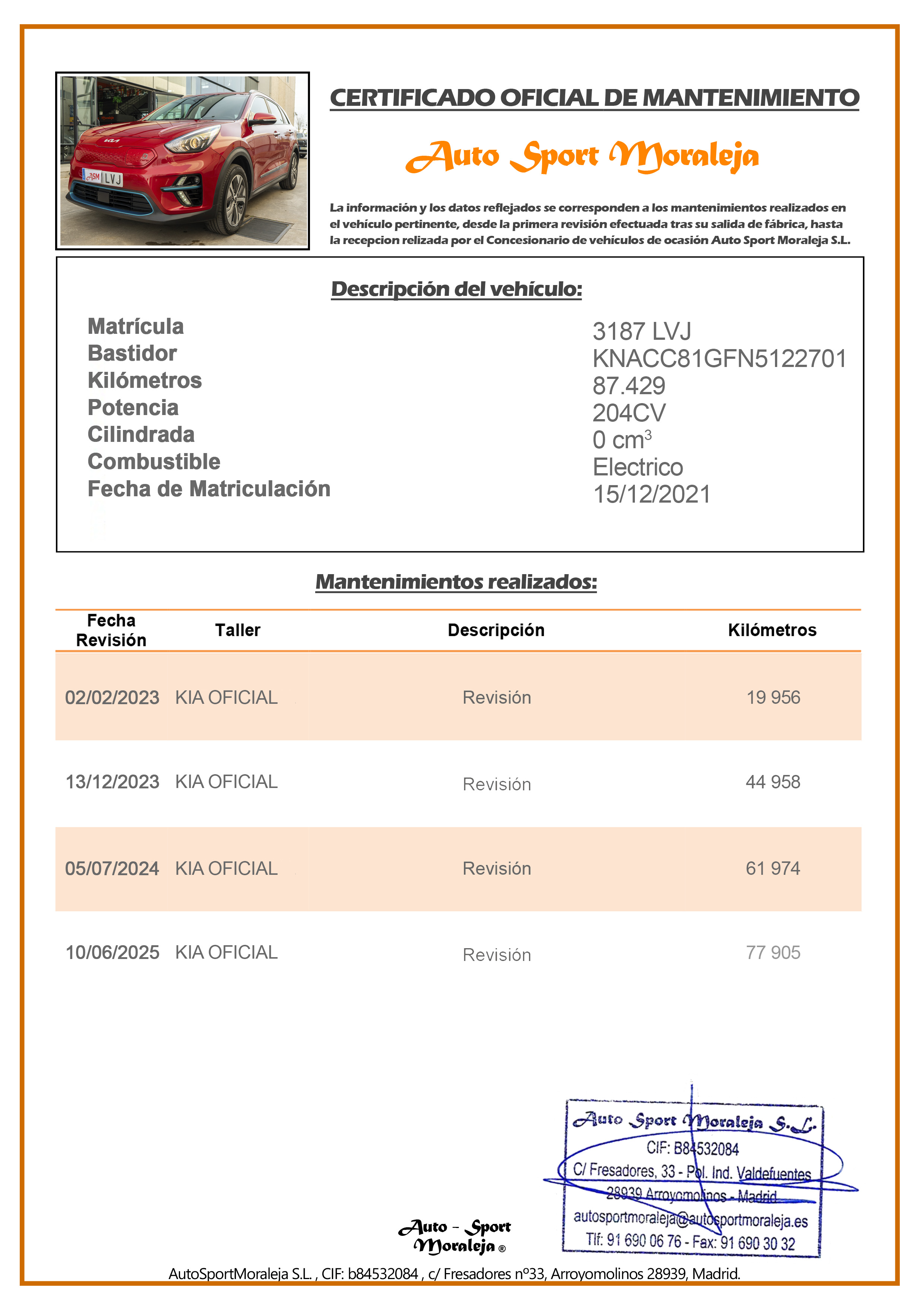 Vehículo nacional de un único propietario. El precio incluye: IVA (deducible) y 1 año de Garantía. Kilometraje y ausencia de golpes estructurales certificados. Última revisión: Concesionario oficial KIA (K M I B RETAIL MADRID S.L.) el 10/06/2025 a los 77.905kms. Visítanos en nuestro concesionario en Arroyomolinos.