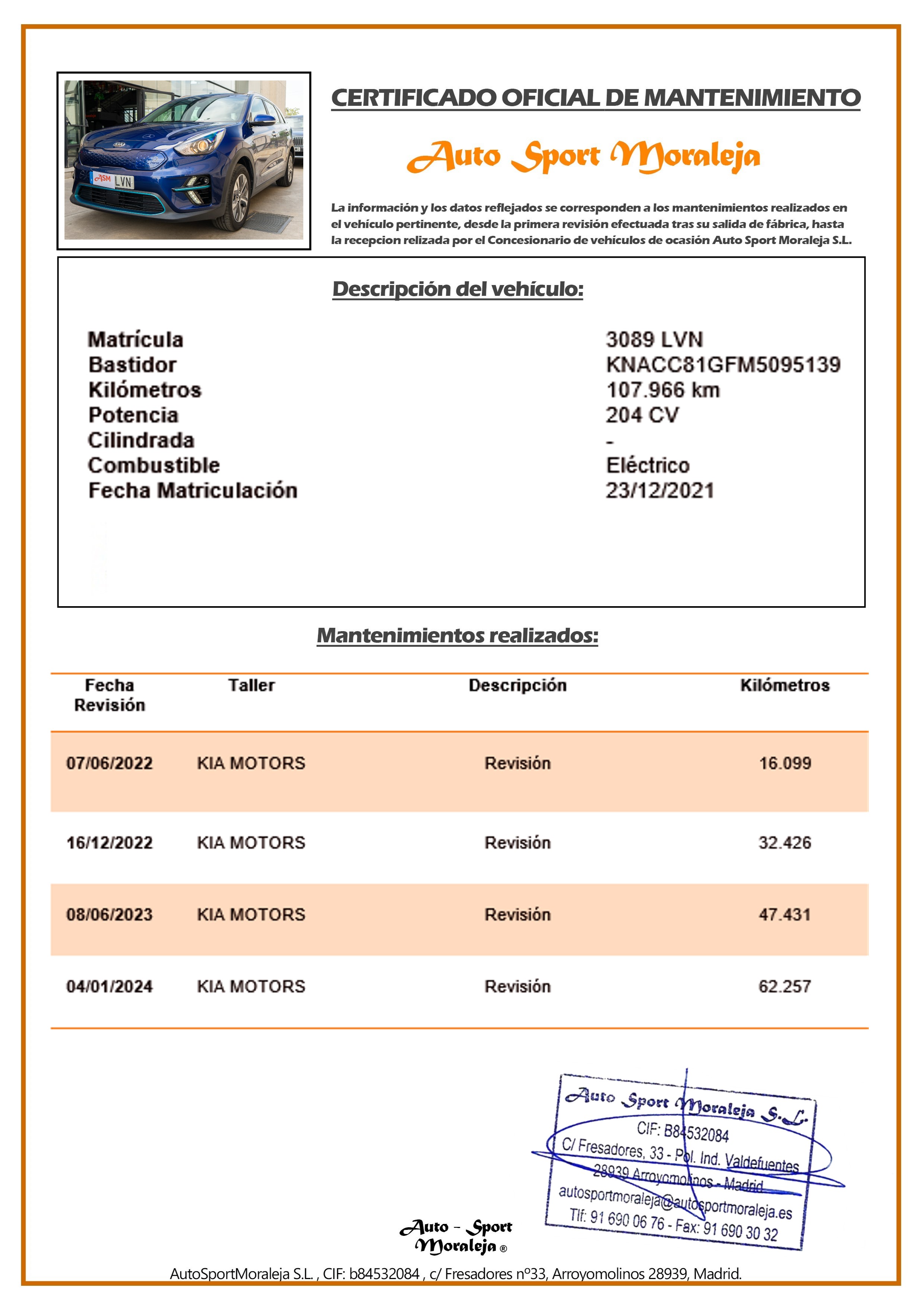 Vehículo nacional de un único propietario. El precio incluye: IVA (deducible) y 1 año de Garantía. Kilometraje y ausencia de golpes estructurales certificados. Última revisión: concesionario oficial KIA el 04/01/2024 a los 62.257kms. Visítanos en nuestro concesionario en Arroyomolinos.