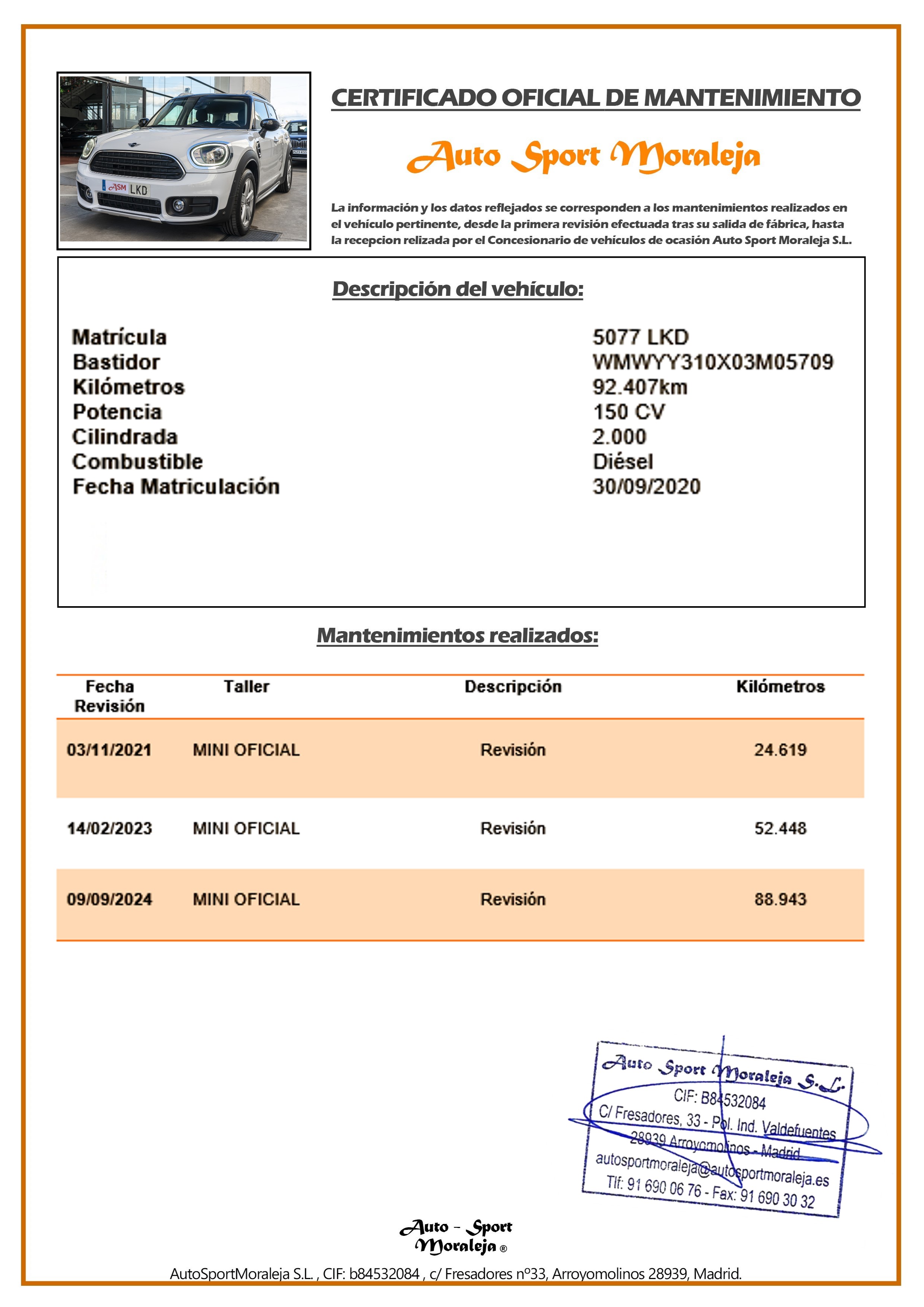 Vehículo nacional de un único propietario. El precio incluye: IVA (deducible) y 1 año de Garantía. Kilometraje y ausencia de golpes estructurales certificados. Última revisión: concesionario oficial MINI el 09/09/2024 a los 88.943kms. Visítanos en nuestro concesionario en Arroyomolinos.