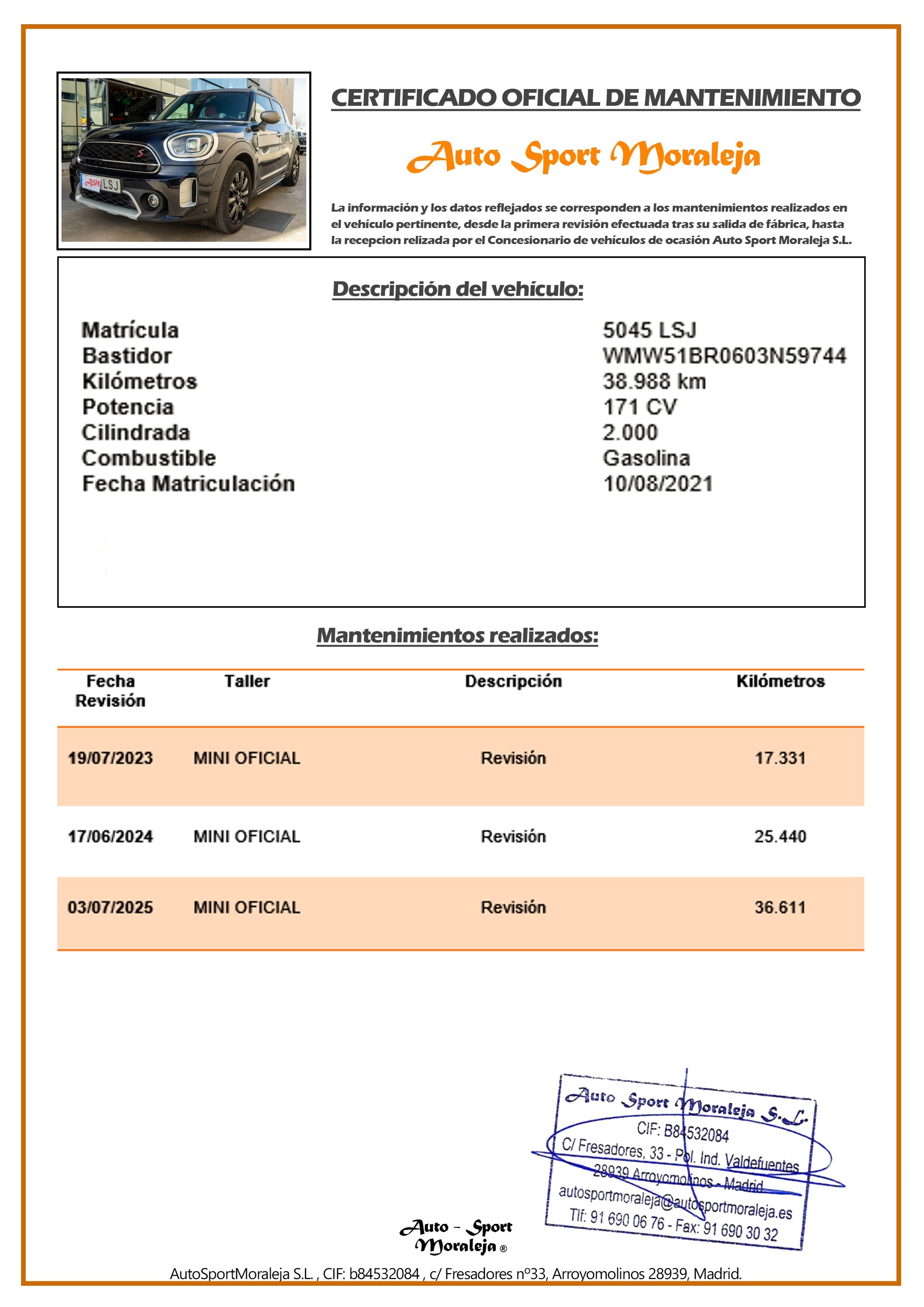 Vehículo nacional de un único propietario. El precio incluye: IVA (REBU) y 1 año de Garantía. Kilometraje y ausencia de golpes estructurales certificados. Última revisión: concesionario oficial MINI el 03/07/2025 a los 36.611kms. Visítanos en nuestro concesionario en Arroyomolinos.