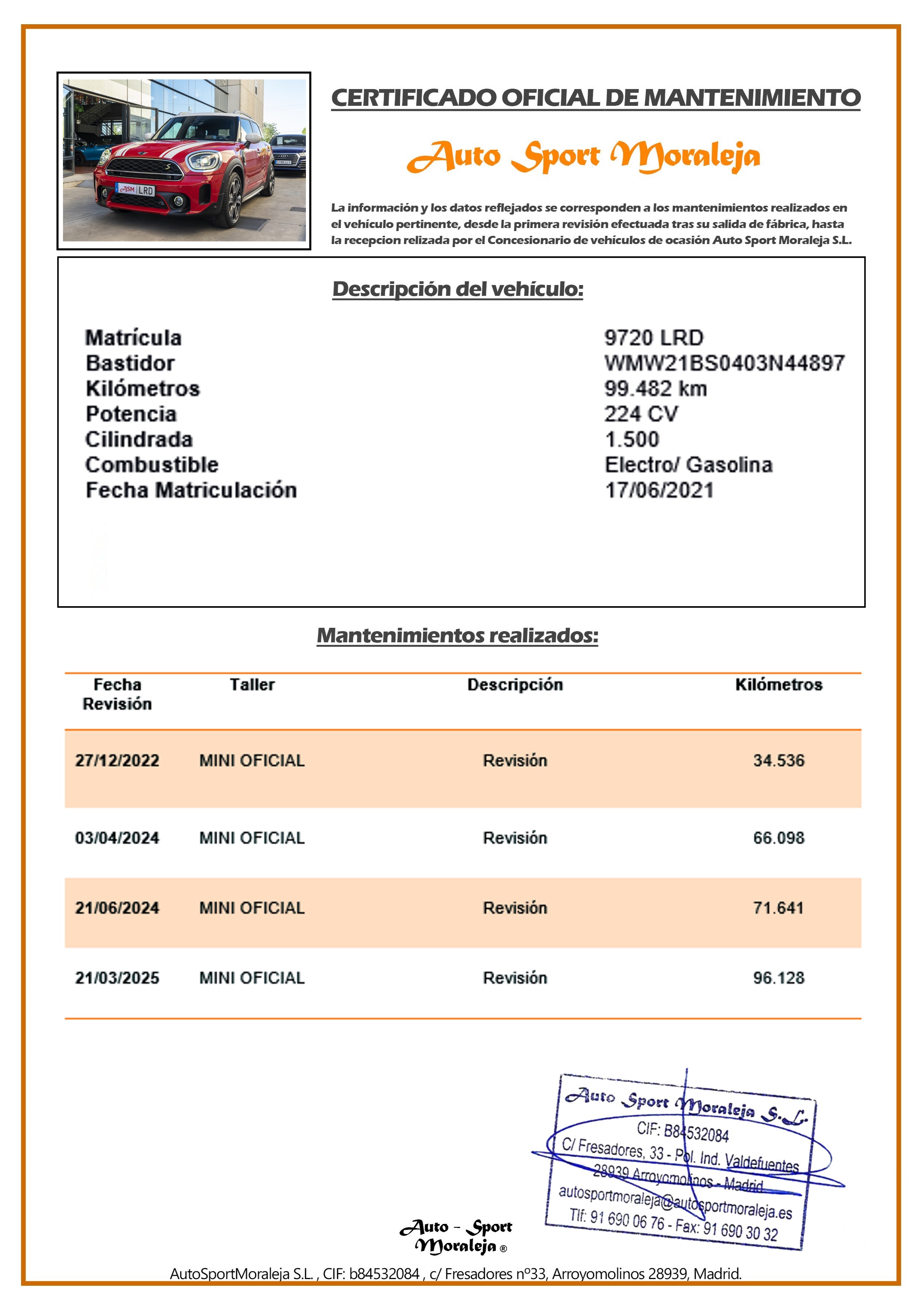 Vehículo nacional de un único propietario. El precio incluye: IVA (deducible) y 1 año de Garantía. Kilometraje y ausencia de golpes estructurales certificados por Carfax. Última revisión: concesionario oficial MINI el 21/03/2025 a los 96.128kms. Visítanos en nuestro concesionario en Arroyomolinos.