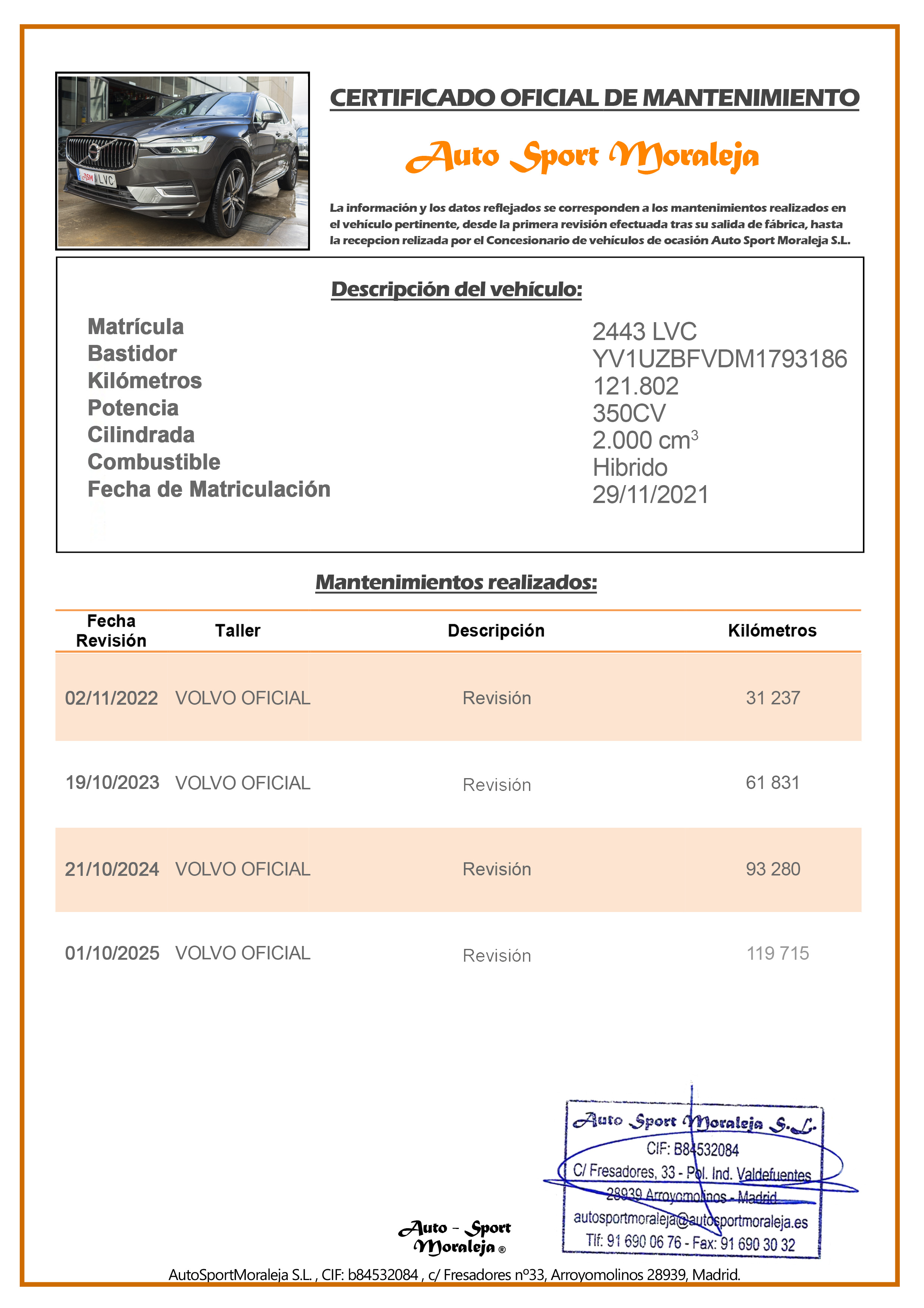 Vehículo nacional de un único propietario. El precio incluye: IVA (deducible) y 1 año de Garantía. Kilometraje y ausencia de golpes estructurales certificados por Carfax. Última revisión: Concesionario oficial VOLVO (AUTO SALON IMPORTACIONES S.A) el 01/10/2025 a los 119.715kms. Visítanos en nuestro concesionario en Arroyomolinos.