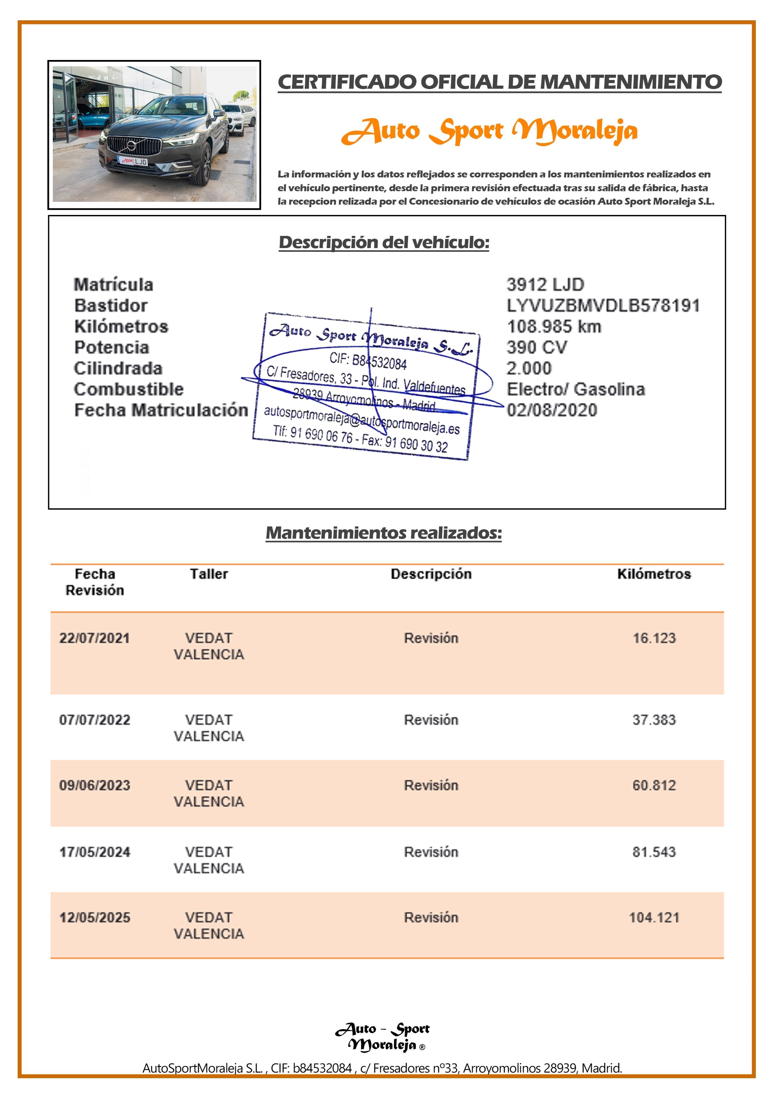 Vehículo nacional de un único propietario. El precio incluye: IVA (deducible) y 1 año de Garantía. Kilometraje y ausencia de golpes estructurales certificados por Carfax. Última revisión: concesionario oficial Volvo (Vedat Valencia) el 12/05/2025 a los 104.121kms. Visítanos en nuestro concesionario en Arroyomolinos.